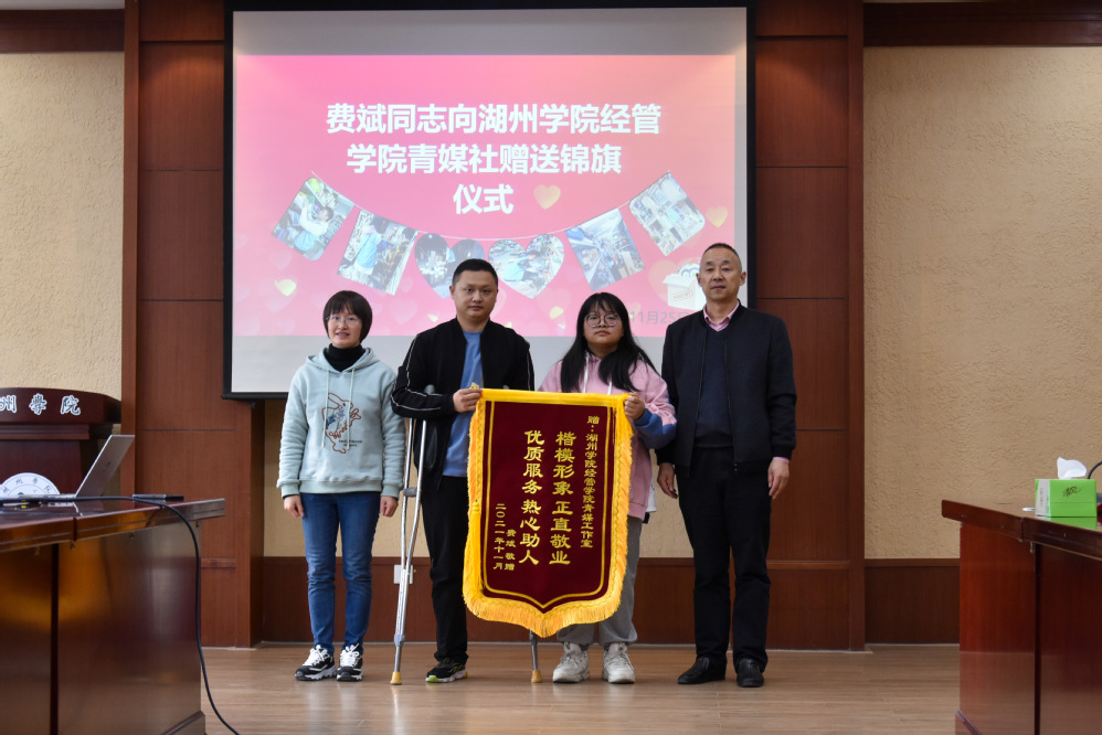 随后,费斌同志对全体青媒社的成员们表达了由衷的感谢,希望日后能用自己的力量帮助到他们,并祝愿他们能够在日后学有所成,砥砺前行。最后,费斌同志向经管学院青媒社赠送锦旗,全体人员合影留念。