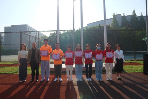 随后,进行读书活动总结表彰。主持人宣布获奖名单,获奖学生代表依次上台,校团委书记杨津婧、学院党委副书记宁培龙、读书活动组织者王慧春为获奖学生颁发证书并合影留念。最后,在我们是五月的花海,用青春拥抱时代;我们是初升的太阳,用生命点燃未来的嘹亮歌声中,升国旗仪式圆满结束。