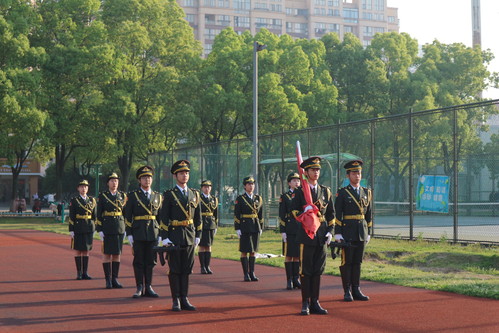 上午7时,国旗护卫队昂首挺胸、精神抖擞,迈着铿锵有力的步伐护卫国旗入场。在雄壮的国歌声中,五星红旗冉冉升起,参加仪式的全体师生怀着无比崇敬的心情向国旗庄严敬礼。