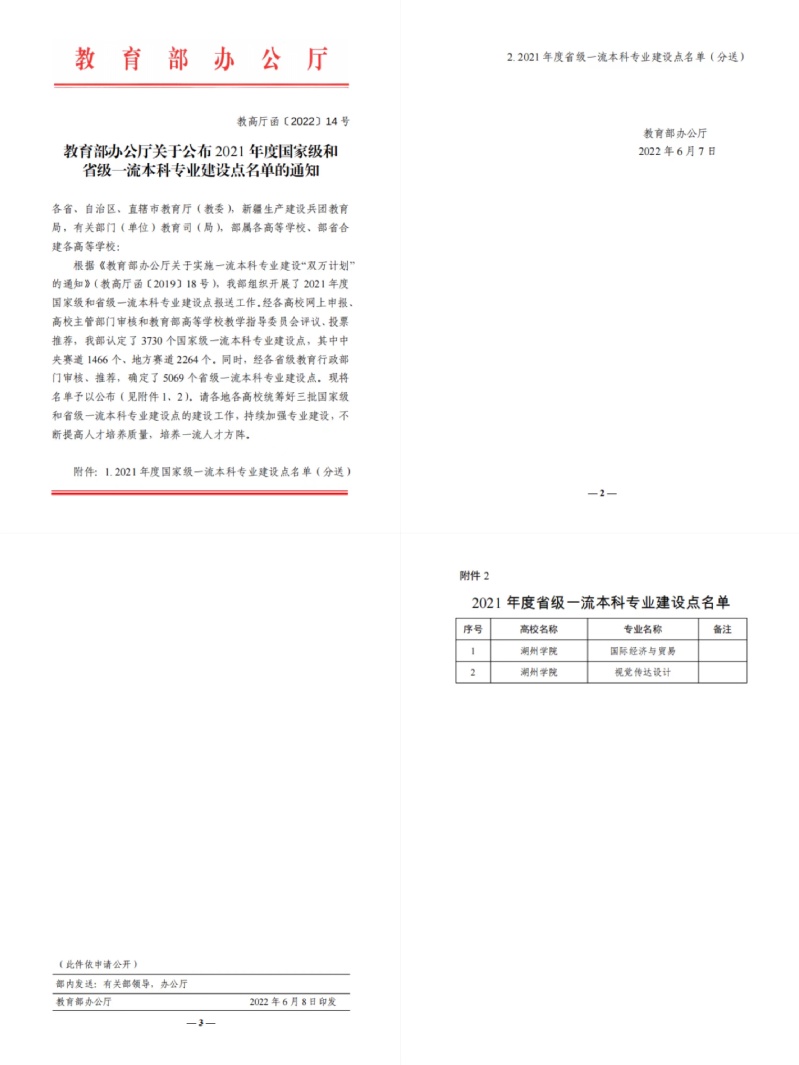近日,教育部办公厅公布了《关于2021年度国家级和省级一流本科专业建设点名单的通知》,36365线路检测中心国际经济与贸易专业喜获2021年度省级一流本科专业建设点,我院共有2个专业获批省级一流本科专业建设点。