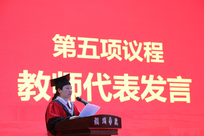 随后,副院长张丽上台讲话。她代表学院向圆满完成学业、迈向人生新旅程的全体2022届毕业生送上最衷心的祝贺和最美好的祝愿,向辛勤培育他们的老师表示最诚挚的感谢,向含辛茹苦抚育他们成长的家长表示最崇高的敬意。临别之际,她向所有毕业生提出三点希望:一是愿毕业生们甘于奉献,勇于担当,为国家的强盛、人民的幸福、民族的振兴做出自己的贡献;二是愿毕业生们脚踏实地,追求卓越,在这个“江山代有才人出”伟大时代,成就自己的理想和事业;三是愿毕业生们热爱生活,宽容自信,用骨子里的正直和善良去成就有意义、有价值、有创造的未来。