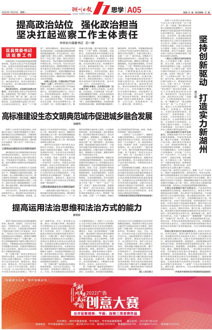 2022年7月25日,《湖州日报》思学版全文刊登我院副教授陆建伟的理论文章《高标准建设生态文明典范城市促进城乡融合发展》,就湖州如何高标准建设生态文明典范城市促进城乡融合发展,提出了研究路径。