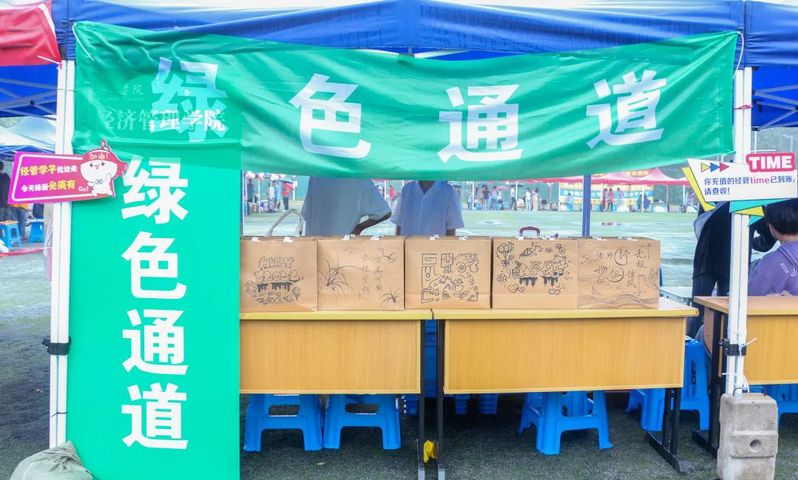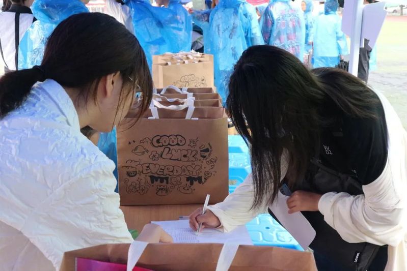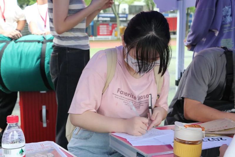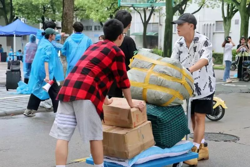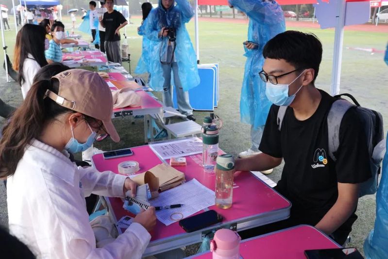 乌云加上细雨,校园内的迎新志愿者们便开始忙碌起来,雨淋不灭志愿者的熊熊烈火,背上的痕迹已看不出是雨水还是汗水。学生志愿者们在车站、校门口、美食广场前、光彩体育场、寝室楼下等处设立迎新服务站点,新生接待车不停歇往返学校、车站两地接送新同学们。