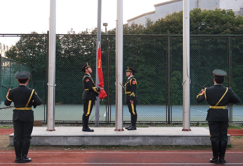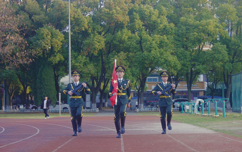 在全体师生的注目礼下,英姿飒爽的国旗护卫队队员们迎着朝阳护送鲜艳的五星红旗进场,行礼完毕,伴随着庄严的《中华人民共和国国歌》,五星红旗冉冉升起,迎风飘扬。在场的每一个人向国旗行注目礼,深怀对祖国无限的热爱和崇高的敬意。